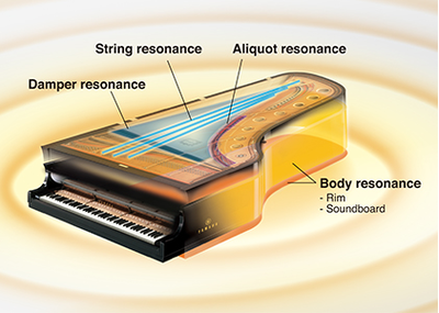In a grand piano, sound resonates throughout the body of the instrument, producing a rich reverberation that envelops the listener in sound. This phenomena is reproduced perfectly through enhanced Virtual Resonance Modeling (VRM). The original VRM calculates the various states of the strings for each of the 88 notes on the keyboard, from one instant to the next, and timing and depth of damper pedals pressed. The enhanced VRM now also calculates aliquot resonance in the upper octaves, and the full resonance of the soundboard, rim, and frame. This technology allows for vivid, bright, richly-varied expression that reflects the limitless number of factors inherent in piano performance.