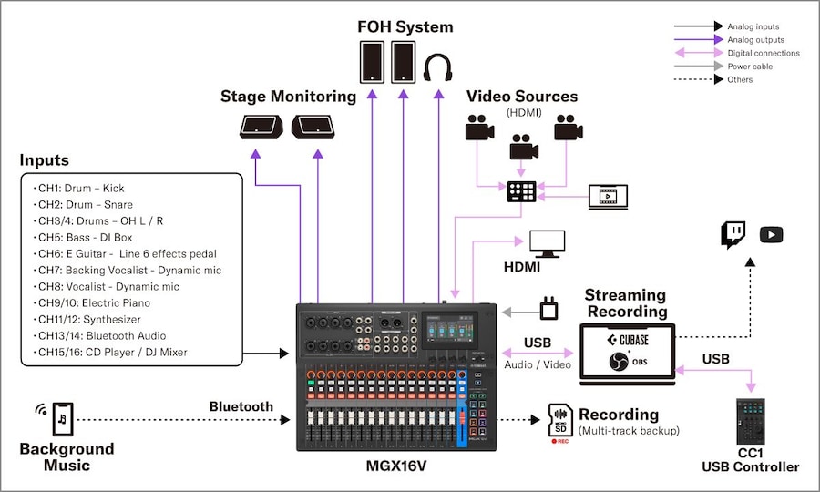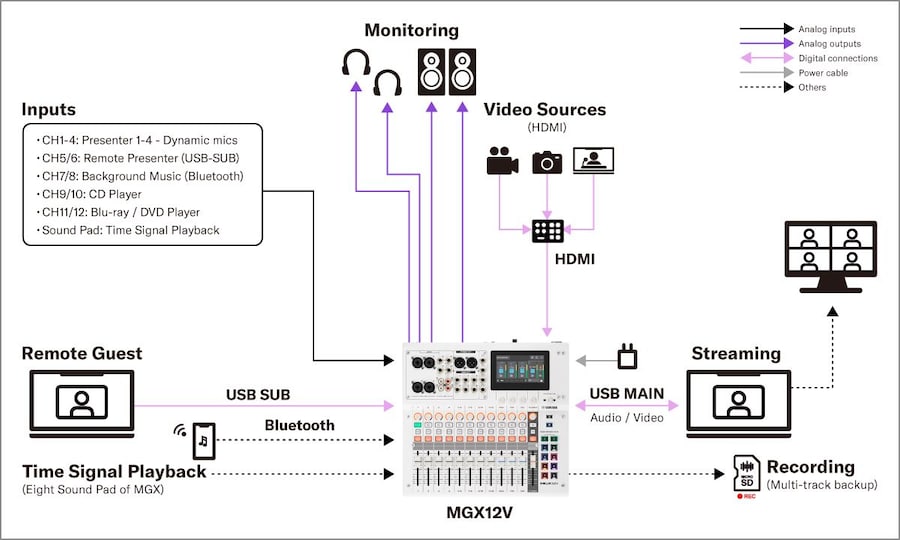 The MGX-V models are equipped with advanced HDMI-USB capture and HDMI pass-through functions, enabling seamless integration of high-definition video into video production or streaming setups. These powerful features allow users to build a compact system that manages PA and monitor audio while supporting both streaming and recording—ideal for applications ranging from small-scale live events and hybrid concerts to podcasting and live streaming.