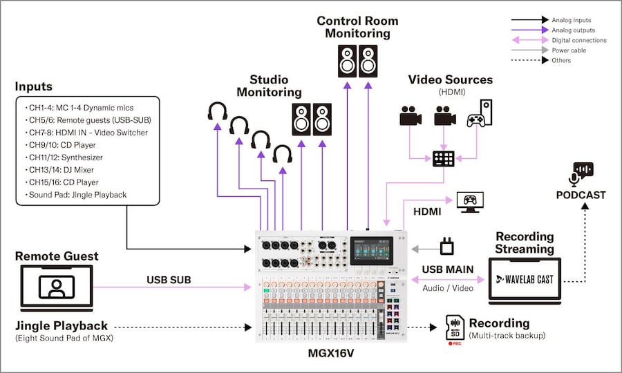 This setup supports video and audio content production by integrating studio microphones, remote guests, playback sources, and video inputs into the MGX12V.