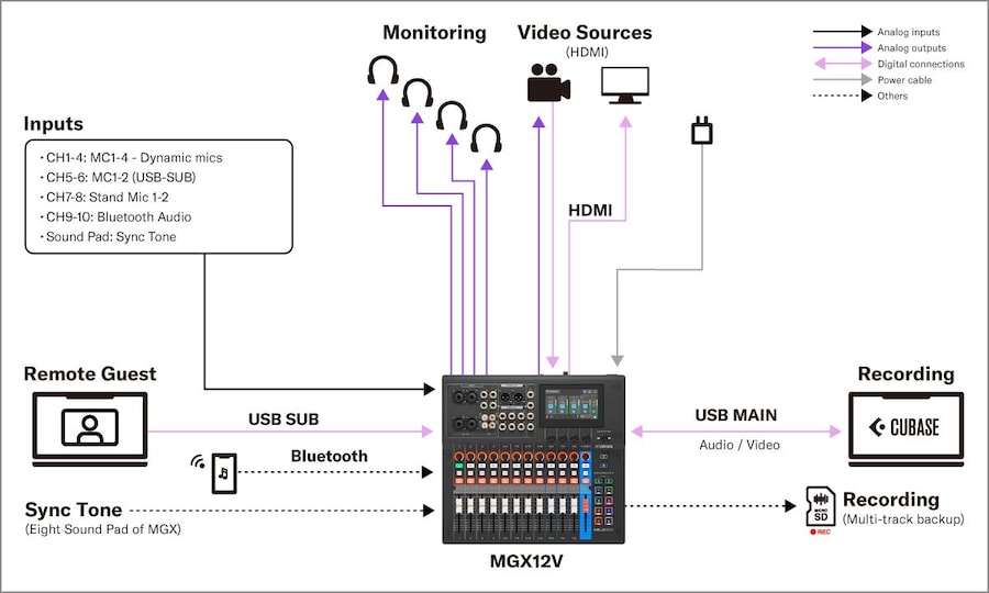 HDMI video sources are combined with the mixed audio and sent via USB to a computer for recording in Cubase, while a simultaneous multitrack backup is captured to a microSD card in the MGX.
