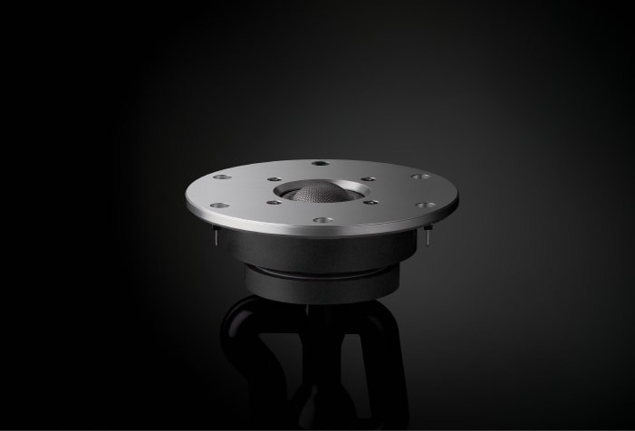 The JA-08B5 8 cm (3-1/4”) soft-dome midrange is made of 100% ZYLON®, molded seamlessly from the diaphragm to the surrund (edge) thanks to our proprietary molding technology. The system design of the NS-5000 began with the crafting of this midrange driver. In order to take full advantage of impressive acoustic velocity and realistic acoustic density that the 100% ZYLON® diaphragm provides, we adopted a dome design — which shortens the distance from the voice coil to the diaphragm to a degree impossible with a cone design, resulting in smaller loss of movement — and we made its diameter 8 cm (3-1/4”), which is the largest feasible size that manufacturing yield allows. The high-pass crossover frequency was set at 750 Hz, optimum for bringing out the very best in this driver.