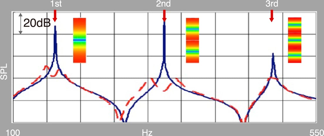 Applying know-how obtained in the development of acoustic conditioning panels, we developed an Acoustic Absorber (patent pending) — a compact J-shaped resonance tube that eliminates standing wave of a specific frequency — and installed two of them in the NS-5000. The speaker's uncomplicated cuboid enclosure helps consolidate internal standing waves at a specific frequency and makes it easy for the Acoustic Absorber to target and suppress that frequency. This eliminates the need for a large amount of sound-absorbing materials inside the enclosure, and helps bring the natural acoustic resonance out of the original music. Acoustic Absorbers also ensure a remarkable continuity in tone between the woofer and the midrange, ensuring that, unlike in a conventional enclosure filled with a substantial amount of sound-absorbing materials, much of the acoustic energy in the high frequency range generated by the woofer is kept intact.