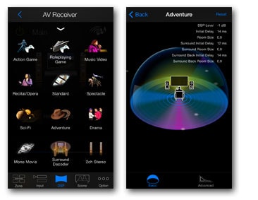 It intuitively fine-adjusts DSP parameters to the best levels. In Basic Mode, pinch in and out actions adjust the sound field space. In Advanced Mode, you can make more accureate adjustments like DSP level, room size, liveness etc.