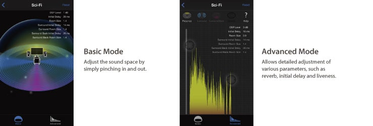 Cet amplificateur AV est équipé de plusieurs programmes sonores reposant sur la technologie DSP de Yamaha. Grâce à ceux-ci il est facile de créer un champ sonore correspondant aux véritables salles de cinéma ou de concert directement chez vous, et de profiter d'un son surround naturel et efficace. Vous pouvez à présent utiliser l’application AV Controller pour ajuster les paramètres DSP selon vos préférences, pour correspondre exactement au film ou concert visionné. Deux modes sont proposés, Basic ou Advanced, qui vous permettent de sélectionner différents types d'ajustement.