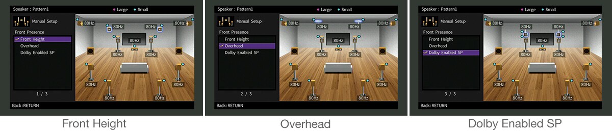 Yamaha propose de nombreux modèles de placement d'enceinte pour assurer une compatiilité parfaite avec Dolby Atmos, créant ainsi la configuration idéale pour votre installation. Tous les modèles peuvent être reproduits avec précision, que ce soit un espace tri-dimensionnel CINEMAP DSP ou Dolby Atmos.