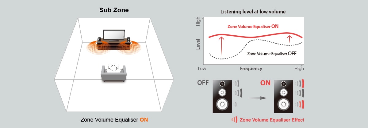 Automatically adjusts bass and treble balance to match the volume on systems in other rooms (Zone 2 and 3). Enjoy movies and music with a natural sound quality balance even at low volumes.