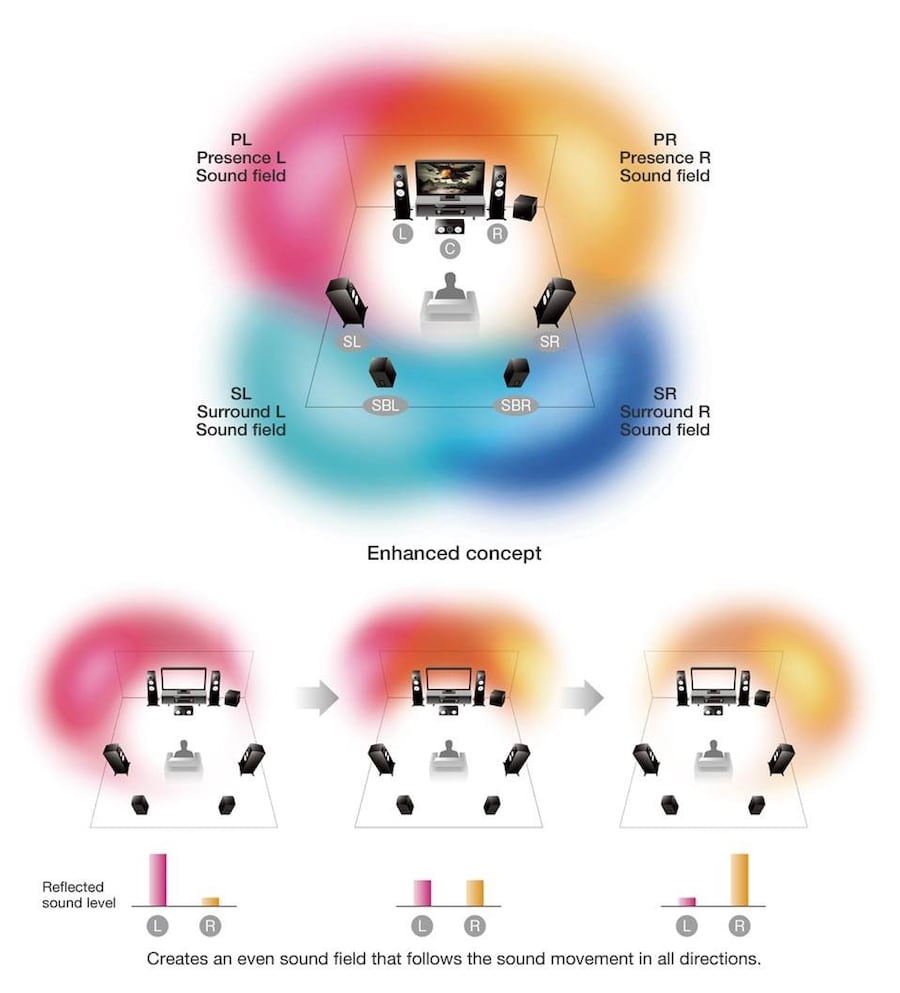 Wide, high and dense sound. CINEMA DSP 3D provides a wide, high and dense sound field. HD Audio format decoding lets you enjoy HD Audio sources. Virtual Presence Speaker delivers three-dimensional sound without the actual use of presence speakers.