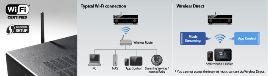 La fonction Wi-Fi intégrée vous permet d’établir une connexion sans fil vers votre router ou box, simplifiant grandement la connexion du système au réseau et l’utilisation des différents services de streaming audio. Si aucun routeur Wi-Fi n’est disponible, la fonction Wireless Direct vous permettra non seulement de streamer votre musique directement depuis votre smartphone ou tablette via AirPlay ou MusicPlay, mais également de contrôler votre amplificateur grâce à l’application AV Controller.