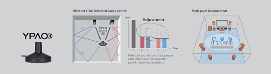 La fonctionnalité YPAO analyse l’acoustique de la pièce et mesure différentes caractéristiques au niveau des haut-parleurs puis calibre les paramètres audio pour atteindre un son optimal pour l’une ou l’autre des huit positions d’écoute. Cette fonctionnalité emploie la technologie Reflected Sound Control pour corriger la réflexion sonore prématurée et ainsi obtenir un son de qualité studio. Ce récepteur permet aussi la normalisation des effets DSP et adapte les paramètres CINEMA DSP en fonction des sons réfléchis.