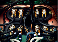 Pour éliminer complètement les pertes d’énergie du signal, les éléments les plus importants disposent de connexions à vis. En plus du câblage du condensateur, qui est le véritable cœur de l’amplificateur et qui demande énormément de puissance, des connexions à vis ont été adoptées pour les points cruciaux de la transmission du signal, dont les connexions du circuit de préamplification au circuit ld’alimentation, et le câblage des terminaux des haut-parleurs depuis les étages de sorties de l’amplificateur. En plus de rendre le chemin emprunté par le sigal le plus court possible, cela réduit l’impédance et les pertes de signal.