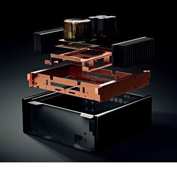 L’A-S3000 profite d’un nouveau design à la rigidité extrême avec une construction double structure permettant d’obtenir une amplification audio pure et précise. Le bas du châssis et les isolants repoussent les vibrations externes, et apporte à chaque circuit une structure flottante supportée par une armature indépendante, réduisant au maximum l’impact des vibrations. La source d’alimentation, constituée d’un transformateur et de condensateurs à l’origine des vibrations internes, est fixée fermement grâce à une structure tridimensionnelle, et supportée par les panneaux avant et arrières. Les circuits d’amplification de puissance et les dissipateurs thermiques sont fixés sur les montants intérieurs gauche et droit. L’alimentation et les circuits d’amplifications sont ainsi isolés structurellement, pour parachever une structure de châssis idéale bloquant toute transmission de vibration. De plus, la structure interne supportant le transformateur dispose de suffisamment d’espace pour profiter d’un raccordement extrêmement court vers chaque circuit. Ce nouveau châssis avec sa structure innovante permet de minimiser la longueur du chemin emprunté par le signal, tout en profitant d’une rigidité maximale et de vibrations minimales. Le résultat est une réduction drastique des pertes de signal, pour une amplification audio remarquablement pure.