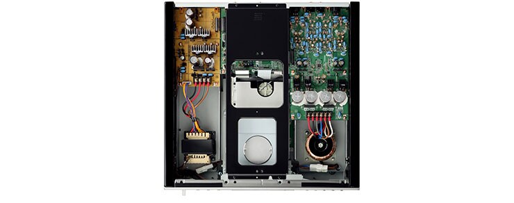 Le CD-S2100 dispose d'une construction totalement symétrique : le mécanisme de chargement à rotation est au centre, l'alimentation pour la section numérique et ses circuits sont à gauche, et l'alimentation pour la section analogique et ses circuits, à droite. L'isolation complète de ces sections analogiques et numériques élimine l'impact des interférences entre circuits, pour une balance idéale. La structure centrale qui d'étend de l'avant à l'arrière du CD-S2100 est constituée d'aluminium épais de 5mm, pour augmenter la rigidité globale du châssis et assurer une lecture stable.