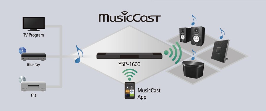 Le système multiroom MusicCast utilise un réseau sans-fil haute performance pour diffuser le son sans altération. Ce protocole peut transférer la musique d’un smartphone, PC ou NAS vers le YSP-1600, ou d’autres appareils MusicCast chez vous. Il permet aussi de partager la musique d’autres appareils comme une TV ou un lecteur Blu-ray connecté au YSP-1600, vers des matériels compatibles. Le contenu audio des smartphones et tablettes Bluetooth peut aussi être distribué aux appareils MusicCast dans plusieurs pièces.