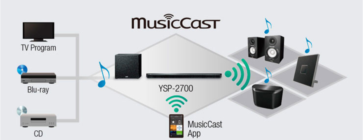MusicCast utilise un réseau sans-fil haute performance pour diffuser le son sans dégradation. Ce protocole peut transférer la musique d’un smartphone, PC ou NAS vers d’autres appareils MusicCast chez vous. Il permet aussi de partager la musique d’autres matériels comme un téléviseur ou un lecteur Blu-ray connecté au YSP-2700. Le contenu audio des smartphones et tablettes Bluetooth peut aussi être distribué aux appareils MusicCast dans plusieurs pièces.