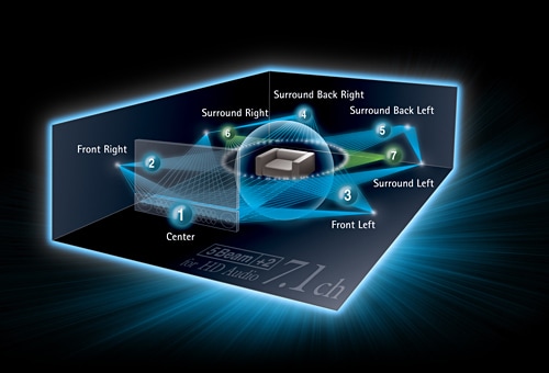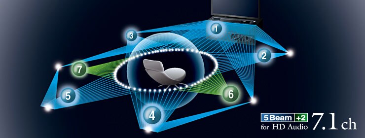 - Controlling the directions of the beams to bounce them off the walls enables the sound to come from five directions: front left and right, rear left and right, and centre. Models from the YSP-4300/3300 create two phantom sound sources in addition to the five beams, to provide 7.1-channel surround sound.