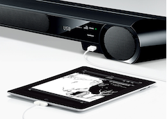 Projecteur de son numérique mince et de grande qualité sonore et Wireless Active Subwoofer offrant une performance de son ambiophonique exceptionnellement élevée, avec la diffusion en continu sans fil et une connexion numérique USB.
