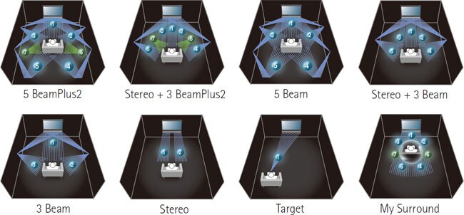 L’YSP-4300 produit un son ambiophonique véritable en dirigeant des rayons sonores vers les murs afin qu’ils atteignent l’auditeur à des angles différents. Le mode principal est 5 BeamPlus2 pour les sources à 7 canaux. De plus, il y a une large gamme de modes d’écoute. Vous pouvez choisir 3 BeamPlus2 + Stereo, 5 Beam, Stereo + 3 Beam, 3 Beam, Stereo, Target et My Surround.