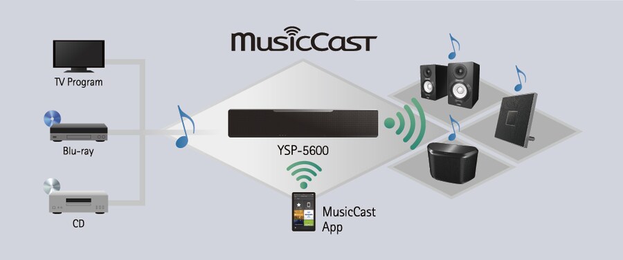 MusicCast utilise un réseau sans-fil haute performance pour diffuser le son sans altération. Ce protocole peut transférer la musique d’un smartphone, PC ou NAS vers d’autres appareils MusicCast chez vous. Il permet aussi de partager la musique d’autres matériels comme une TV ou un lecteur Blu-ray connecté au YSP-5600. Le contenu audio des smartphones et tablettes Bluetooth peut aussi être distribué aux appareils MusicCast dans plusieurs pièces. Tous les modèles MusicCast sont compatibles Bluetooth. Non seulement vous pouvez diffuser les contenus de votre smartphone - y compris à partir des services de vidéo et de musique - mais vous pouvez les distribuer dans d’autres pièces. En outre, une large variété de formats sont compatibles, parmi lesquels MP3, WMA, AAC, Apple Lossless, WAV, FLAC et AIFF.