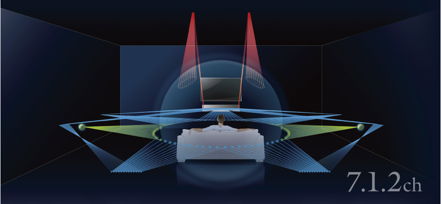 Derrière la grille frontale se trouvent 44 haut-parleurs judicieusement disposés. Pour créer les faisceaux sonores à 7 canaux (Avant G/D, Centre, Surround G/D, Hauteur G/D), chaque haut-parleur est contrôlé séparément et alimenté par son propre circuit d’amplification. Tout ces faisceaux sont projetés sur les murs et le plafond afin d’être réfléchis avec précision vers la position d’écoute pour recréer un système audio similaire à une configuration sonore avec des enceintes à l’arrière et au plafond : la reproduction surround 3D est réelle, non virtuelle. De plus, le YSP-5600 utilise le faisceau de canal Surround pour reproduire les canaux Surround Back, le canal Surround étant encapsulé en mode Phantom pour proposer une restitution Dolby Atmos ou DTS:X à 7.1.2 canaux.
