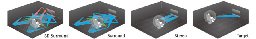 Le YSP-5600 propose quatre modes d’écoute : Surround 3D, qui contrôle cinq faisceaux horizontaux et deux verticaux pour recréer l’équivalent d’un champ sonore tridimensionnel 7.1.2 canaux ; Surround, utilisant cinq faisceaux horizontaux pour une lecture 5.1 normale ; Stéréo, avec un haut-parleur spécial à faisceau vertical en tant que tweeter pour reproduire un son de haute qualité en deux canaux ; et Target, qui projette les voix mono avec clarté vers un endroit précis de la pièce. En mode Surround 3D vous pouvez aussi activer le mode CINEMA DSP 3D, alors qu’en mode Surround vous pouvez utiliser le mode CINEMA DSP, offrant une plus grande variété de champs sonores.