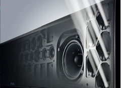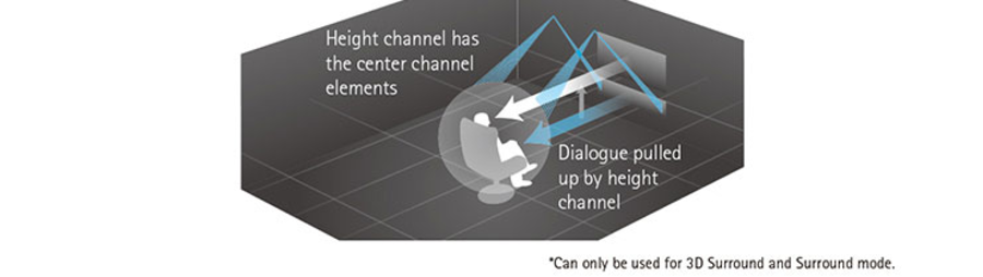 Le canal hauteur est créé en plaçant six haut-parleurs en ligne à chaque bout de l’appareil (pour un total de douze). Des unités de 28 mm sont utilisées pour ces derniers. Afin d’obtenir un effet de faisceau maximal, ils sont fixés sur un baffle incliné et le contrôle vertical de faisceau est adapté. La restitution du champ sonore est la même que si de vraies enceintes étaient au plafond. Vous obtenez ainsi un résultat identique sans l’encombrement d’une lourde installation.