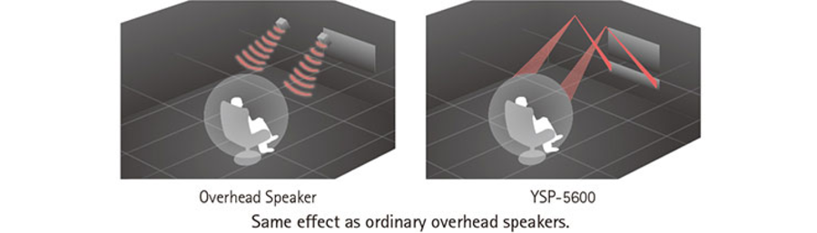 Les haut-parleurs hauteur peuvent être situées très près de la position d'écoute à l'instar des haut-parleurs centraux. Leur position et la qualité audio ont un effet notable sur la sensation de performance live créée par le son multidimensionnel. En utilisant des faisceaux réfléchis sur le plafond pour reproduire les canaux hauteur, le YSP-5600 leur assure un positionnement précis et un son distinct, assurant une restitution réaliste des effets environnementaux comme par exemple le tonnerre. Pour une expérience au rendu 3D réellement divin.
