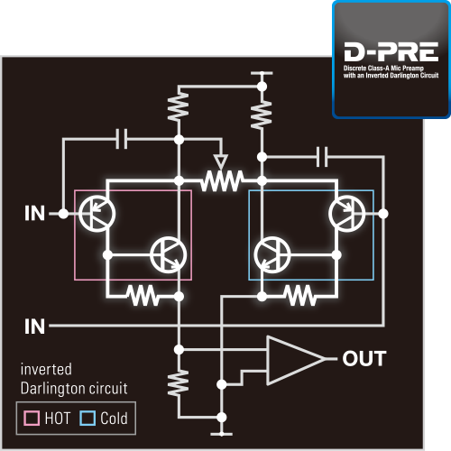 D-PRE preamps deliver fat, natural sounding bass and smooth, soaring highs, with very low distortion. They utilize an inverted Darlington circuit comprising two cascading transistors in a configuration that provides more power with lower impedance. D-PRE preamps possess an impressively wide frequency range without overly amplifying any specific elements of the sound.