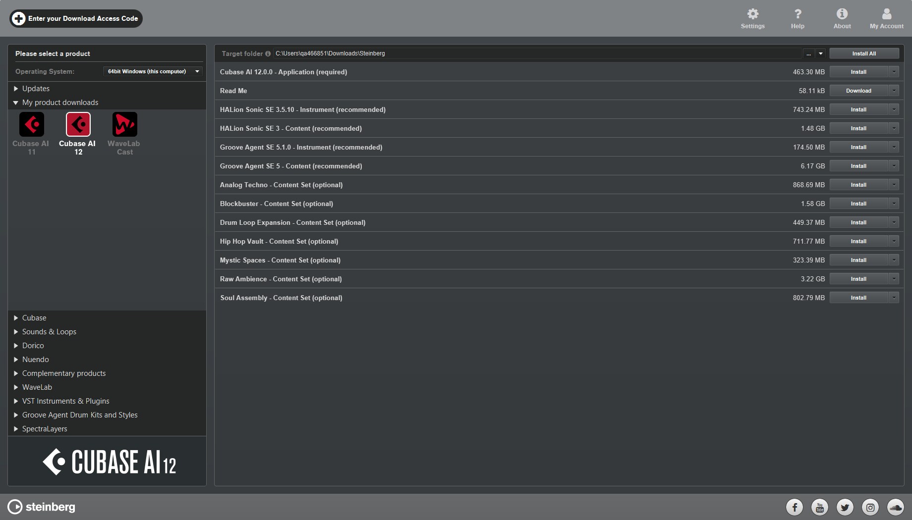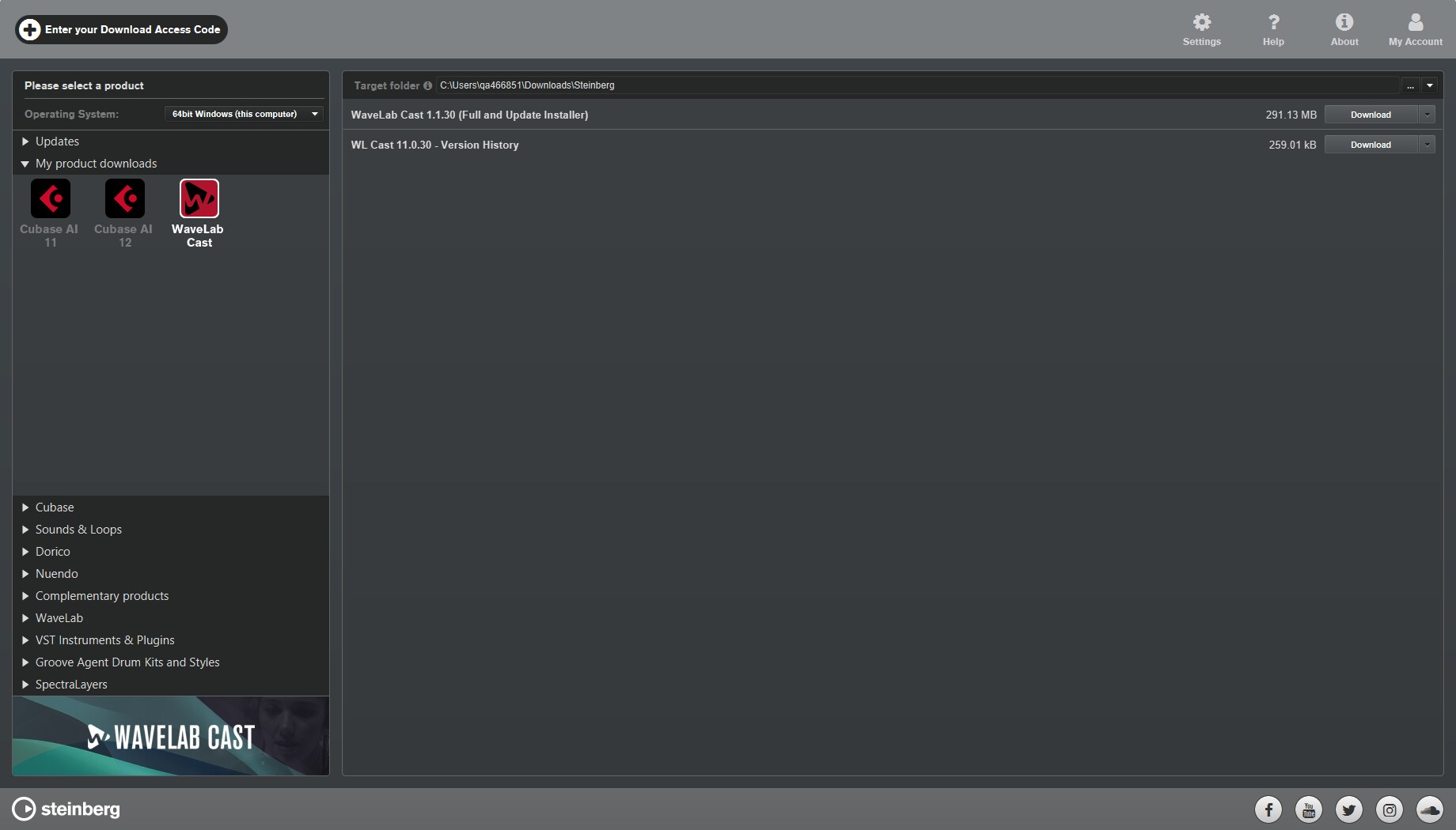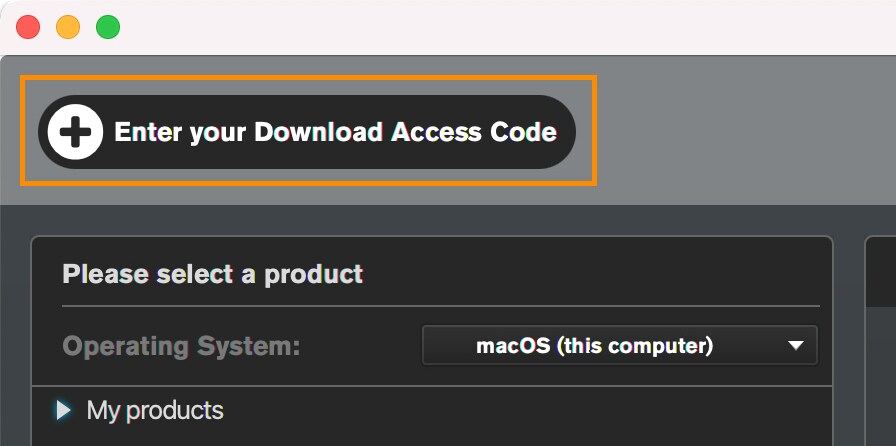 Saisissez votre code d'accès au téléchargement à partir du bouton en haut à gauche dans Steinberg Download Assistant.