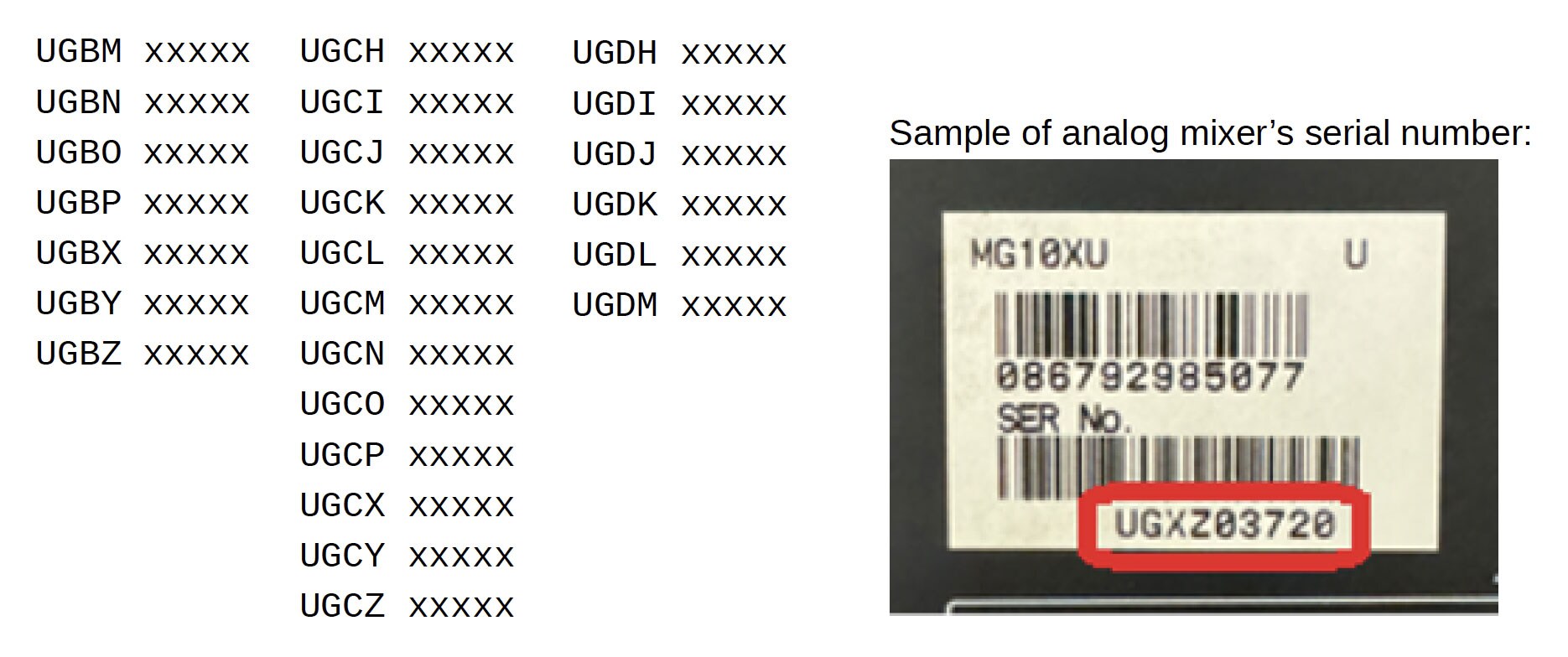 Les numéros de série des consoles de mixage analogiques qui peuvent contenir un adaptateur secteur défectueux vont de UGBM xxxxx à UGDM xxxxx (xxxxx se réfère à 5 chiffres). Ci-dessous, vous trouverez une liste des motifs de numéros de produit applicables.
