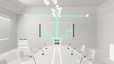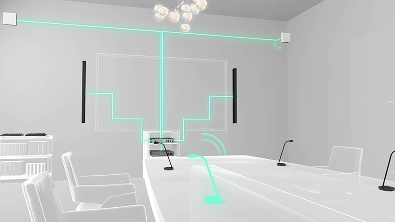 The comprehensive conferencing solution introduces the ceiling array microphone and remote conference processor, and includes long-trusted PoE network switches and Dante PoE powered speakers.
