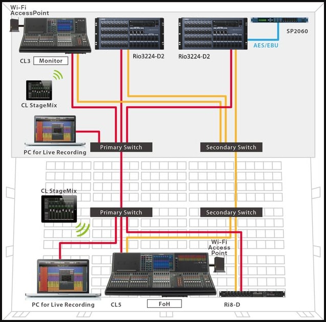 Internal port switches allow the CL consoles to be easily set up for daisy-chain or star network configurations. In this example the Console at FOH position is directly connected to the I/O rack at the side of the stage. The network is self-configured. Of course the CL StageMix iPad app can be used even in simple systems like this one, and Dante Virtual Soundcard can be used to enable multitrack recording to a DAW such as Steinberg’s Nuendo.