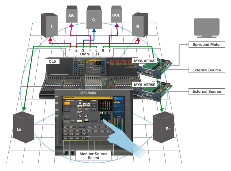 External surround sources are fed to the console via a Mini-YGDAI expansion slot so that sources can be switched and monitored via the console. The surround signals can also be fed to an external surround meter via a Mini-YGDAI slot.