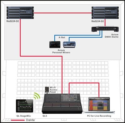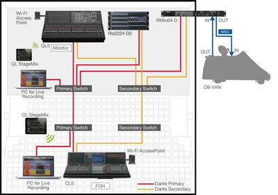 In this compact but capable live sound system a CL series console serves front—of—house while a stage side QL console doubles as monitor mixer and I/O device thanks to its Port to Port capability. The Gain Compensation function means that head amp gain can be safely controlled from either console without interference. For maximum system reliability a star network configuration with network switches is used for redundancy, so that a problem in one part ofthe network will not interrupt the overall signal flow, Live recording to multiple computers is also possible.