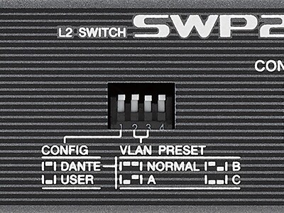 A truly efficient network should be able to handle multiple services simultaneously: Dante communication, StageMix and other smart device functions, computer software that allows digital mixer or power amplifier control, and perhaps more. But the more communication you combine on one network, the greater the chance for interference and problems. The use of virtual VLAN domains to isolate the various types of data is the ideal solution, but this type of setup also requires some IT expertise. The SWP2 series includes three VLAN presets that can be simply selected via a DIP switch. There’s also a USER mode that allows fully customized VLAN setup.