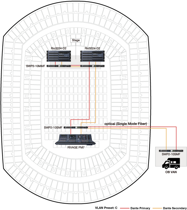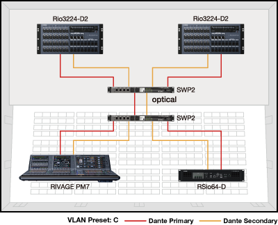 In this example VLAN Preset C has been set up on the SWP2-MMF and SWP2-SMF switches, with the Dante primary line assigned to VLAN1 and the secondary line assigned to VLAN2. Single mode Optical fiber connection between the switches allows reliable data transmission over distances of up to 10 kilo meters.