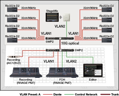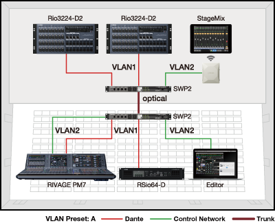 In this case VLAN Preset A is used, where VLAN1 handles the Dante network while VLAN2 hosts control signals such as for Editor or StageMix from Dante’s audio signals, making the network more stable.