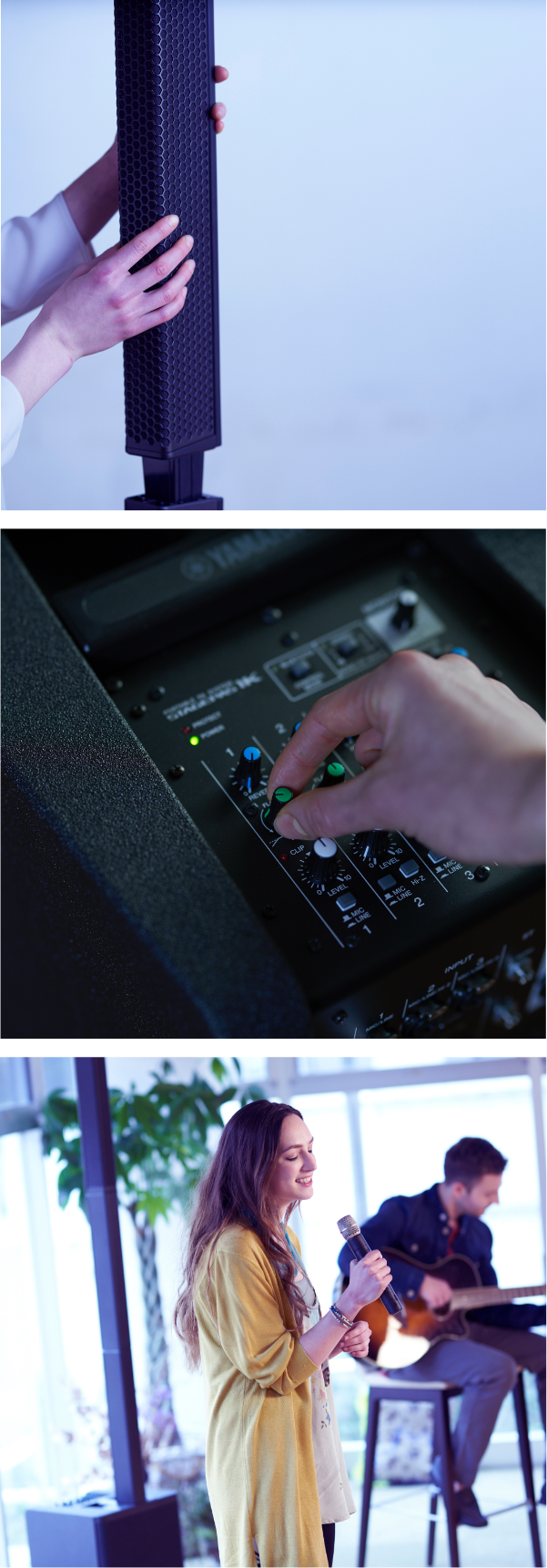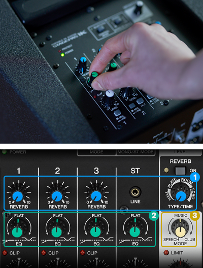 Le STAGEPAS 1K est doté de plusieurs réglages permettant le traitement du son, dont un égaliseur 1-knob à contrôle unique exécutant simultanément différents processus d'égalisation, et une fonction «Mode» permettant d'optimiser le son pour le type d'événement, comme un discours ou une soirée musicale. Ces réglages peuvent être effectués simplement avec un seul bouton, ce qui rend le mixage facile et rapide sans devoir apprendre des fonctionnalités complexes. Vous pouvez ainsi vous concentrer sur votre performance sans vous soucier de l’aspect technique.