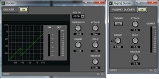 The Ducker component reduces the volume level of other channels when audio input is detected at a specified “KEY IN” channel. If a microphone input is specified as the KEY IN channel while other channels are receiving output from a background music source, for example, the level of the background music will automatically be reduced whenever an announcement is made via the microphone, and then return to normal when the announcement ends. The Paging Ducker adds a TRIGGER function that allows prioritization of trigger inputs.