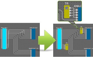 This function graphically displays the audio routing and channel on/off status within configurations, making it easy to pinpoint causes of common problems such as undesired audio output or no audio output.