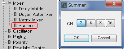 Summer is a Mixer component that simply mixes multiple input signals. It can be used as a simple mixer, such as combining faders and summers flexibly, or simply converting stereo signals into mono signals. There are 4 types of inputs of Summer, 2, 4, 8, and 16 lines, and the output is 1 line.