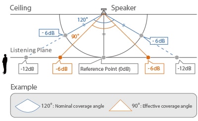 It is important to note that the nominal coverage angle listed in ceiling speaker specifications is not the same as the speaker’s actual effective coverage angle. SPL at the nominal coverage angle is 6dB lower than the on-axis SPL, measured at a constant distance from the speaker. The effective coverage angle is defined as the angle at which the SPL is 6dB lower than the on-axis SPL at the listening plane. The effective coverage angle is usually about 70~80% of the nominal coverage angle. CISSCA calculations are based on effective coverage angles.