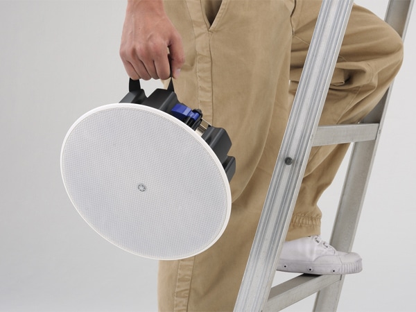 Un dispositif antichute maintient fermement le plafonnier en place, de façon à pouvoir procéder à son installation en toute sécurité et avec efficacité. Le levier de dégagement permet de dégager doucement le haut-parleur du plafond si nécessaire.