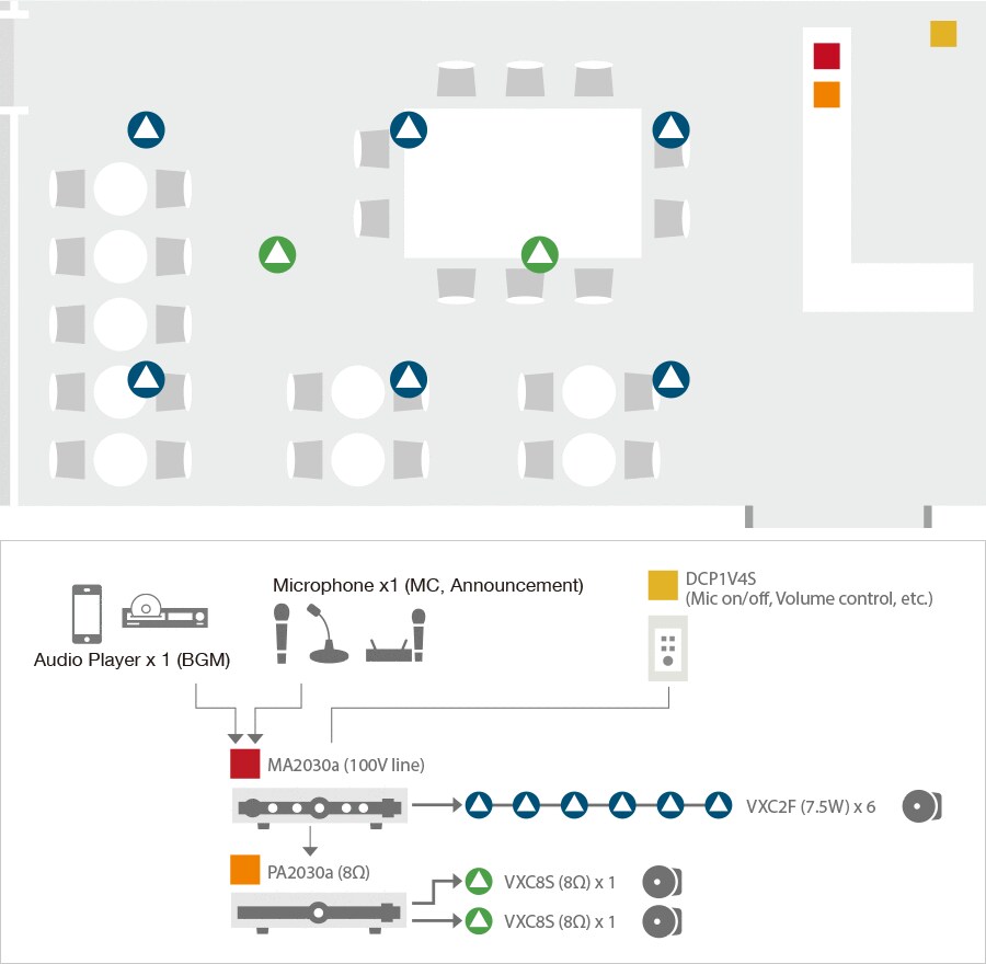 With VXC2F speakers and a mixer amplifier MA2030a, it is possible to create a streamlined, high-performance system that allows microphone use while background music is being played. Add a power amplifier PA2030a and a ceiling subwoofer VXC8S to create enriched ambient.