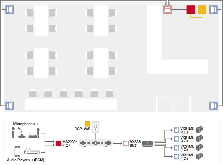 This is a system that connected VXS3S with high impedance and constructed multiple satellites. You can easily change the required volume by switching the output W number by tapping. The MA2120 can deliver different sources at different volumes in the respective zone.