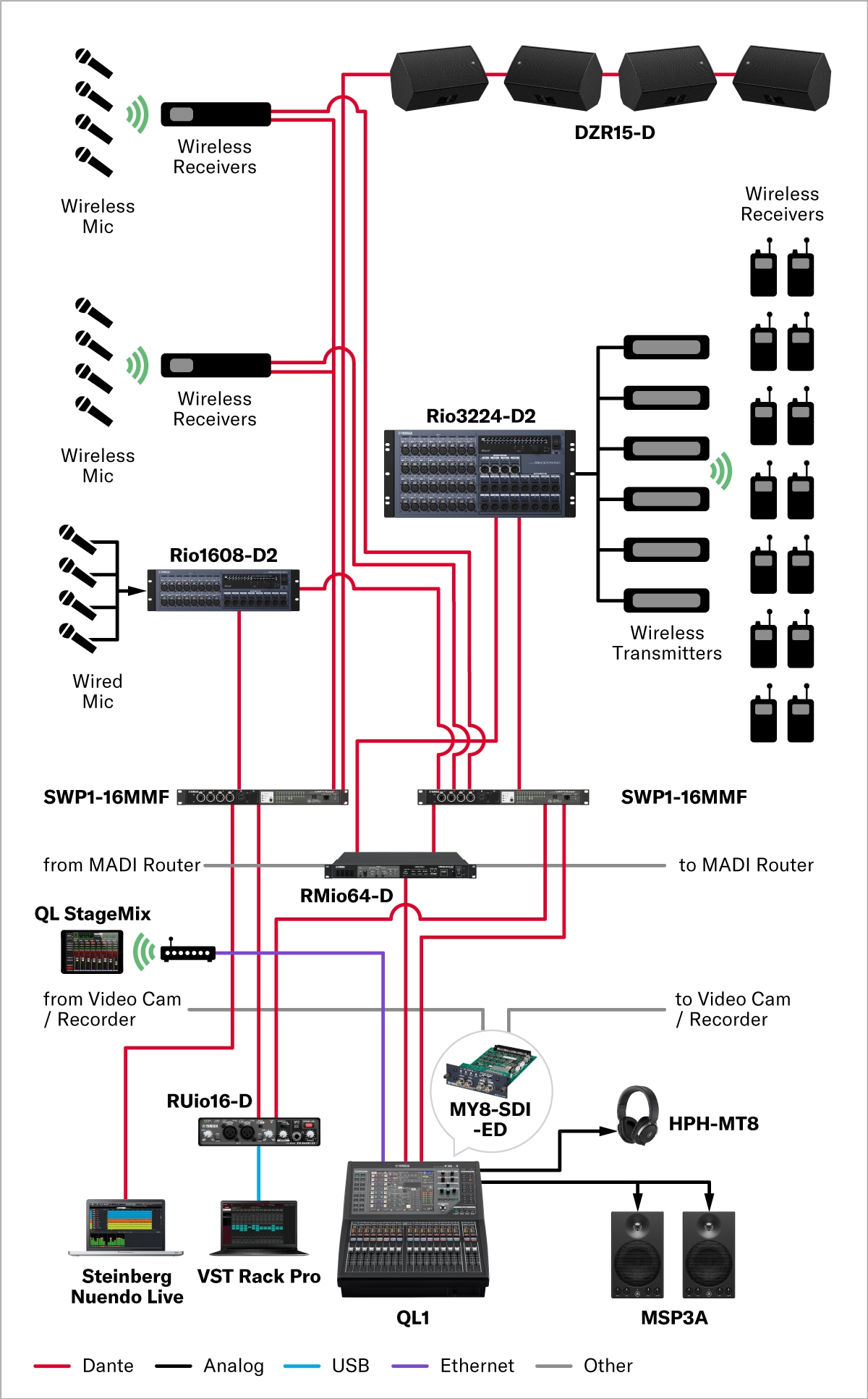 This is a system for music and voice recording. From single microphone setups to simultaneous recording of dozens of channels, Yamaha equipment and software allow you to configure a system that ideally suits your objectives, scale, and budget. By utilizing an audio network such as Dante, wiring can be simplified significantly without sacrificing sound quality.