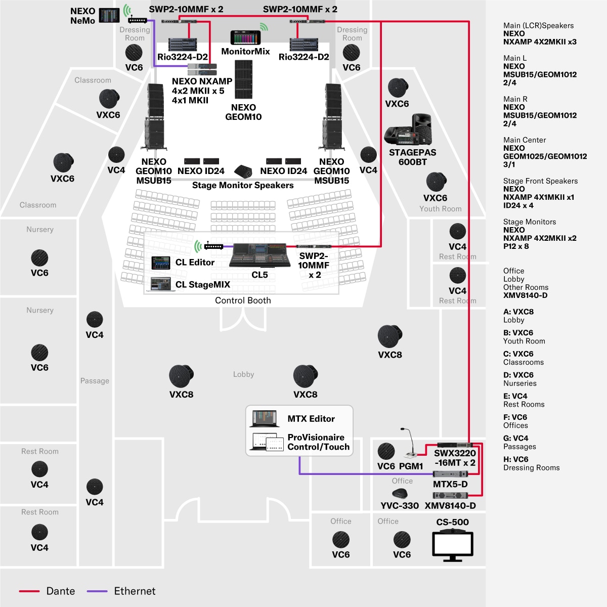 This is a fixed facility system servicing a primary space with a capacity of approximately 800-1000 seats. The powerful line array loudspeakers deliver clear, consistent sound throughout the main area, while the same mix plays through ceiling speakers in ancillary listening areas, including the lobby. The ProVisionaire custom control app and the control linkage function from the mixer also provide convenient operability options, even for more sophisticated systems.