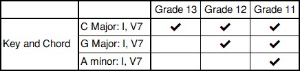 Les candidats écoutent trois accords consécutifs et chantent/nomment ( Niveau 13), jouent (Niveaux 12, 11) les noms des notes des accords.