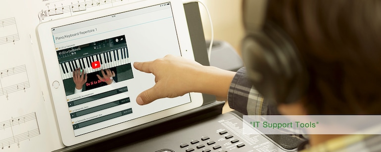 Les manuels scolaires contiennent une variété de pièces célèbres. (chefs-d'œuvre classiques, p. ex. Für Elise, Marche turque, standards de jazz, chansons de Disney, etc.). Pour toutes les pièces, Yamaha ajoute des arrangements et des accompagnements opulents, et l'expérience acquise en les jouant avec des orchestres ou des groupes donne aux élèves une vision du monde particulière de chaque pièce et nourrit leur créativité.
