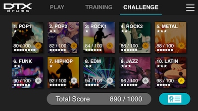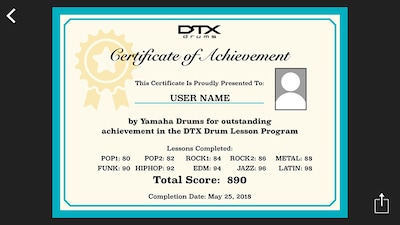 “Challenge Mode” is a new function on the DTX402 Touch that tests your skill. If you can play all 10 practice songs without making a mistake, you will receive a “Drummer’s Certificate” from the Yamaha DTX drum team that you can share via social media.