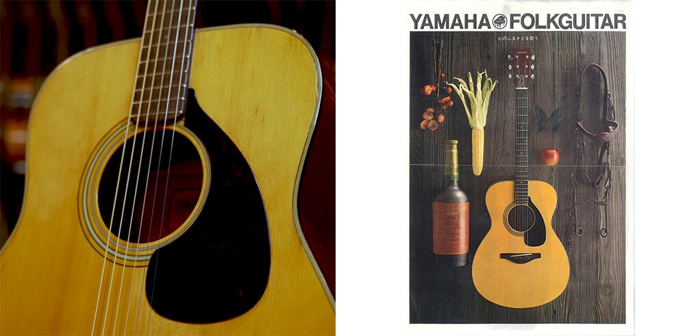 Left: FG-180 pickguard / Right: Advertisement at the time the FG-180 was released (1966)